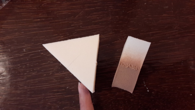 Salah satunya saya memakai sponge foundation yang berbentuk segitiga. Harganya murah, gak sampai 20 ribu, tapi satu plastik dibagi 8, pakainya cukup lama.