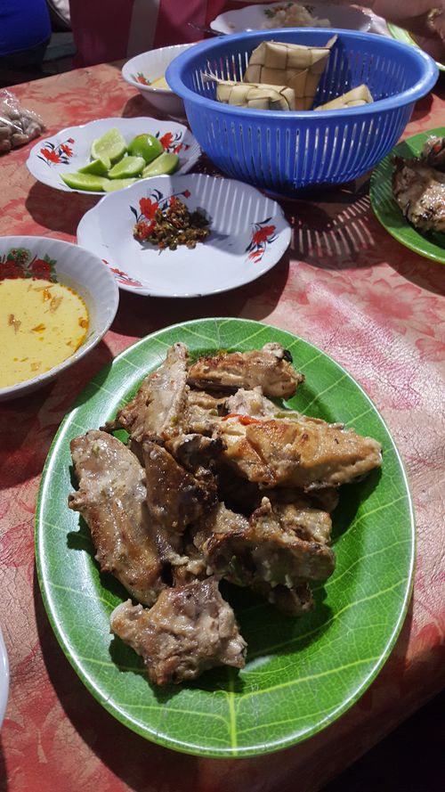 Makannya pakai ketupat dan ada kuah kuningnya. Dikucur jeruk nipis dan sambel… haihhh haucek.